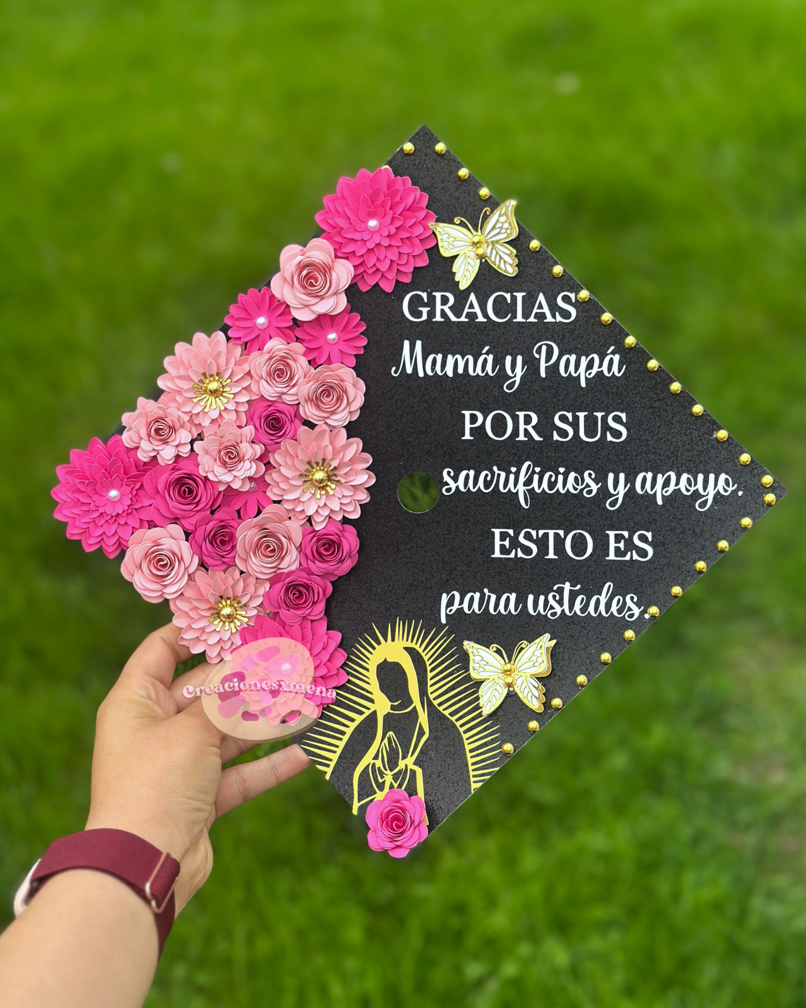 All of our designs are premade, but if you’re looking for something custom (different flowers, background colors, added bows, etc.), feel free to email us at creacionesxmena@gmail.com or message us on Instagram at @creacionesxmena!